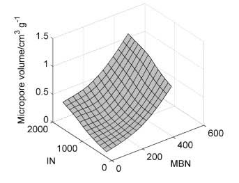 也使用二次模型將微孔體積描述為亞甲藍和碘值的函數(shù)。該模型在總共50個樣本的幫助下構(gòu)建,其中從KS算法中選擇了14個樣本進行校準(zhǔn)。校準(zhǔn)范圍為0.05至0.99cm 3 g -1。從2至427毫克克變化亞甲藍號-1和碘號碼變化從195至1670毫克克-1。建模導(dǎo)致表面擬合(圖3),由公式5描述: