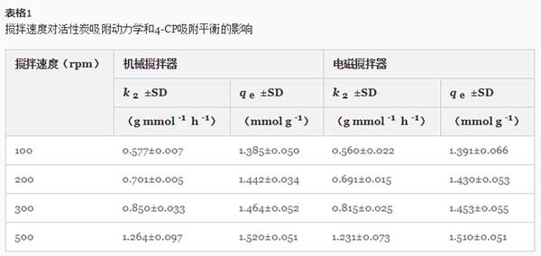 表1中的數(shù)據(jù) 也表明,攪拌速率不僅影響吸附動力學(xué),而且影響4-CP從水中的去除效率。吸附容量從1.385增加到1.520 mmol·g -1(機械攪拌器)和從1.391增加到1.510 mmol·g -1(磁力攪拌器),攪拌速度從100增加到500rpm。觀察到從20.06 4-CP的吸附容量的增加至23.04毫克克-1攪拌速度從300到600轉(zhuǎn)。然而,一些作者已報道,用增加攪拌速度只能達(dá)到一定的限度,超過此有在吸附容量無顯著增加吸附增加。在一些情況下,觀察到在更高的攪拌速率在吸附容量的降低。正如作者所提出的,這是由于這樣一個事實,即在非常高的攪拌速度下,吸附分子和吸附劑顆粒的動能增加到足以使它們相互碰撞而導(dǎo)致分離松散結(jié)合的吸附分子。
