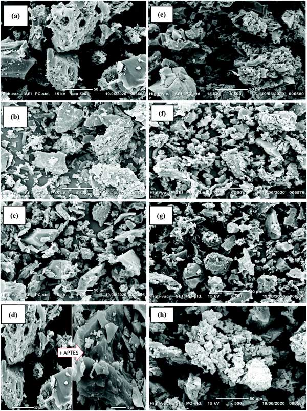 材料的SEM圖像在圖1中給出。活性炭具有不均勻的光滑表面,粒徑約為50μm(圖1a)。在用硝酸和過氧化氫進(jìn)行氧化處理后,氧物質(zhì)(羧基和硝酸鹽基團(tuán))被接枝,導(dǎo)致活性炭-OH的表面比活性炭更粗糙(圖1e)。通過APTES處理接枝氨基硅烷是成功的:活性炭-APTES和活性炭-OH-APTES表面分別比活性炭和活性炭-OH更光滑(圖1d和f)。裂縫和不均勻的空腔可用作氟化物的吸附位點(diǎn)。存在的粗糙表面和大量白色顆粒證實(shí)了Al顆粒的添加(圖2c、g和h)。這些白色顆?梢詫(yīng)于結(jié)合到材料表面的不同形狀和尺寸的Al納米顆粒的不同簇。