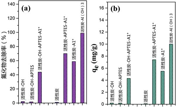 圖2:活性炭的各種處理對(a)氟化物去除百分比和(b)吸附能力的影響。