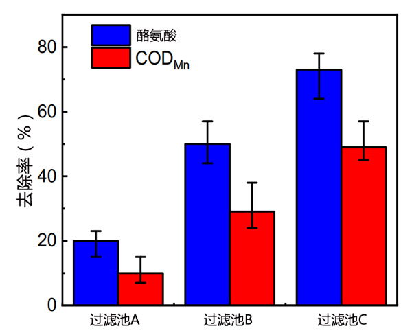 活性炭濾池出水二氯乙腈前體酪氨酸和CODMn的平均去除率如圖2所示。實(shí)驗(yàn)過程中,三個(gè)活性炭過濾器出水酪氨酸濃度依次下降:過濾器C(73%)>過濾器B(50%)>過濾器A(20%)(p<0.05)。生物濾池出水的酪氨酸濃度低于進(jìn)水。誰記錄了飲用水處理廠生物過濾后出水中DON濃度的增加,表明DON總體出水濃度的變化并不代表個(gè)體的變化,而是過濾器中不同個(gè)體的變化規(guī)律也不同。平均出水CODMn去除率的變化趨勢(shì)與平均出水酪氨酸去除率一致。CODMn去除率可以反映生物濾池中有機(jī)物的去除情況。酪氨酸是一種有機(jī)物,其分子結(jié)構(gòu)中含有還原性酚羥基和氨基,可被高錳酸鉀氧化。因此,CODMn去除率也可以作為酪氨酸去除的依據(jù)。