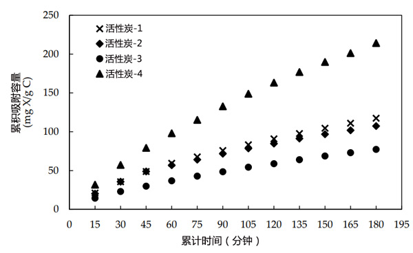 活性炭是去除有機物的常用吸附劑。吸附性能主要取決于其比表面積和微孔結(jié)構(gòu)。它們具有較高的內(nèi)部孔隙率,因此具有較高的吸附性。在本研究中,對四種具有不同表面性質(zhì)的顆;钚蕴繕悠(活性炭-1、2、3和4)進行了去除黃藥的測試。將兩克活性炭樣品與50毫升1590毫克/升的黃藥溶液混合15分鐘。過濾活性炭,并用紫外-可見光譜法測量溶液中的殘余黃藥。通過重復(fù)使用碳樣品,重復(fù)該程序12次,以達到大吸附量。如圖1所示,活性炭-4的吸附容量比較高,因此選擇其進行進一步研究。