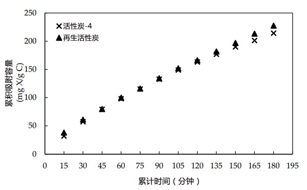 活性炭具有一定的吸附能力。隨著越來越多的成分被吸附在其表面上,吸附能力會隨著時間的推移而降低。一旦達到最大吸附容量,就不能再有效使用。對于活性炭樣品的再生,吸附的成分可以通過加熱破壞。在這部分研究中,在其表面吸附黃原酸鹽的廢活性炭樣品通過在550℃下加熱1小時進行再生。圖2比較了初始活性炭和再生活性炭樣品的吸附性能。再生活性炭和活性炭樣品的累積吸附黃藥量相差不大。結(jié)果表明,吸附在用過的活性炭上的黃藥被破壞了,它被有效地恢復(fù)并可以重復(fù)使用。