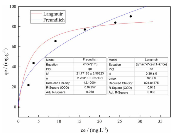當(dāng)反應(yīng)溫度為25℃,投加量為8g/L時,可獲得不同初始濃度下亞硝基二乙胺的平衡濃度和改性活性炭的平衡吸附容量。使用Langmuir和Freundlich熱力學(xué)方程對數(shù)據(jù)進(jìn)行擬合,結(jié)果如所示圖3從圖中可以看出,吸附過程不符合Langmuir等溫線方程,F(xiàn)reundlich吸附等溫線方程也適用。當(dāng)初始濃度達(dá)到一定值時,吸附趨于平衡并達(dá)到飽和。