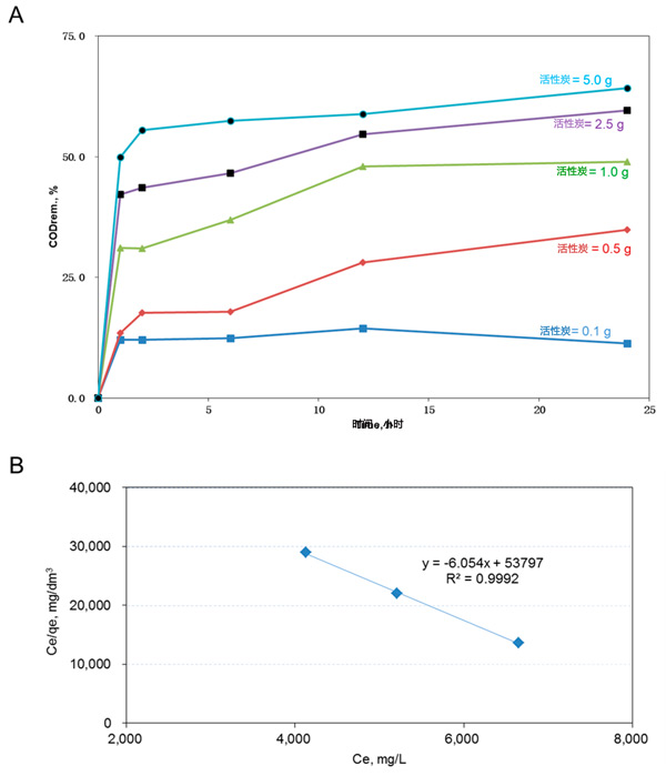 圖1:使用過的活性炭的吸附特性。(A)去除的COD百分比與用于吸附染色廢水COD的活性炭量的關(guān)系圖。(B)Ce/qe比率與Ce的關(guān)系圖。
