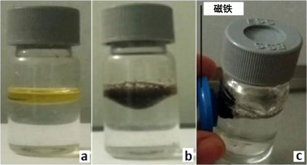 圖1:活性炭的選擇性和浮力的定量說明:(a)機(jī)油/水混合物,(b)將活性炭添加到機(jī)油/水混合物后30秒,(c)借助磁棒去除油吸附的活性炭磁性粒子。