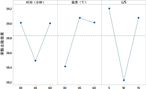 田口法用于優(yōu)化參數(shù),即時(shí)間、溫度和L/S,這些參數(shù)直接取決于苯酚的去除。選擇田口方法的選項(xiàng)越大越好。本研究的主要目的是活性炭從廢水中去除較多的苯酚,因此選擇了越大越好的選項(xiàng)。此外,采用添加劑模型來(lái)確定各個(gè)輸入?yún)?shù)對(duì)去除苯酚濃度的影響。這種分析稱為因子效應(yīng)的確定,結(jié)果見(jiàn)圖2。