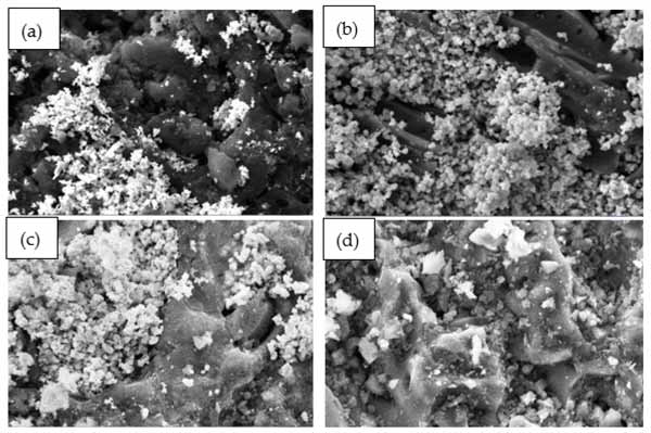 圖1:活性炭雙金屬浸漬吸附劑的SEM形態(tài)圖像,比例放大2.5Kx(2μm)。(a)ZnAc2/ZnO/活性炭,(b)ZnAc2/KOH/活性炭,(c)ZnAc2/TiO2/活性炭,(d)ZnAc2/活性炭。