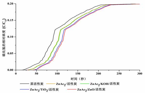 通過選擇合成吸附劑對(duì)硫化氫氣體的吸附效果產(chǎn)生了如圖3所示的吸附曲線。這些吸附曲線也與使用浸漬活性炭和原活性炭實(shí)現(xiàn)的吸附進(jìn)行了比較。我們發(fā)現(xiàn)吸附趨勢(shì)呈指數(shù)增長,形成S曲線。突破時(shí)間被確定為硫化氫濃度達(dá)到1ppm(突破濃度)和飽和濃度達(dá)到幾乎5000ppm的值所用的時(shí)間。與其他雙金屬活性炭吸附劑相比,ZnAc2/ZnO/活性炭吸附劑的吸附表現(xiàn)出優(yōu)異的性能。雙金屬活性炭吸附劑的合成表現(xiàn)出良好的性能,與ZnAc2/活性炭和原活性炭相比,硫化氫的吸附增加了30.2-45.8%和85.9-89.1%。因此,采用這種浸漬方法的活性炭表現(xiàn)出的高吸附增強(qiáng)了硫化氫吸附能力。