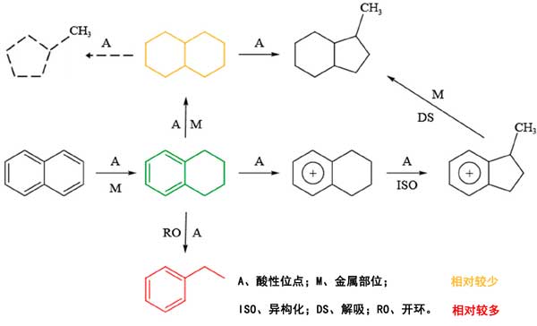 萘在改性活性炭催化劑上的加氫路徑如圖4所示。與氧化鋁催化劑上的類似,活性炭催化劑上的萘在酸性位點和MoS2的共同作用下可以生成四氫化萘和十氫化萘。四氫化萘在酸性位點與烷基苯形成碳鎓離子,然后異構化為甲基-茚碳正離子,最后在活性位點解吸成1-甲基-茚滿。同時,四氫化萘在酸性位點受到溢氫作用時,苯環(huán)的α位和γ位斷裂,生成乙苯。通過從酸性位點上的MoS2活性位點溢出氫氣,萘烷進一步加氫裂化為1-甲基-茚滿。與氧化鋁催化劑相比,活性炭催化劑產(chǎn)生更多的四氫化萘和更少的萘烷,這是因為活性炭催化劑比氧化鋁具有更少的酸位。