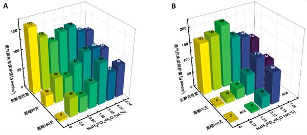 用磷酸三鈉12水合物(Na3PO4·12H2O)在活性炭上進(jìn)行類(lèi)似的實(shí)驗(yàn),活性炭失活后干燥。實(shí)驗(yàn)在11.03wt.%的濃度下進(jìn)行,相當(dāng)于4.00wt.%的NaH2PO4·H2O的摩爾當(dāng)量。很明顯,磷酸三鈉在抑制衰老方面并不有效。經(jīng)過(guò)3個(gè)月的加速失活,保護(hù)值甚至低于未改性的活性炭。然而,Na3PO4·12H2的效率可能會(huì)降低如果在酸性環(huán)境中或與酸或酸性化合物一起添加,效果會(huì)更好。這是因?yàn)樗嵝詶l件可以向磷酸鹽提供質(zhì)子,導(dǎo)致磷酸鈉有效地充當(dāng)Na2HPO4或NaH2PO4?傮w而言,結(jié)果表明,在由磷酸及其三種鈉鹽組成的磷酸鹽添加劑中,一元鹽NaH2PO4·H2O是抑制失活最有效的添加劑。