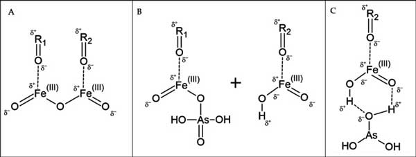 圖3:(A)顯示物理吸附到活性炭表面的鐵。(B)顯示了由于暴露于砷而形成的兩種鐵產(chǎn)物FeOOH和中間體FeO–O–AsH2O3。(C)顯示了還原的As(III),這是電子從活性炭流過(guò)鐵的結(jié)果,通過(guò)氫鍵物理吸附到載鐵表面。