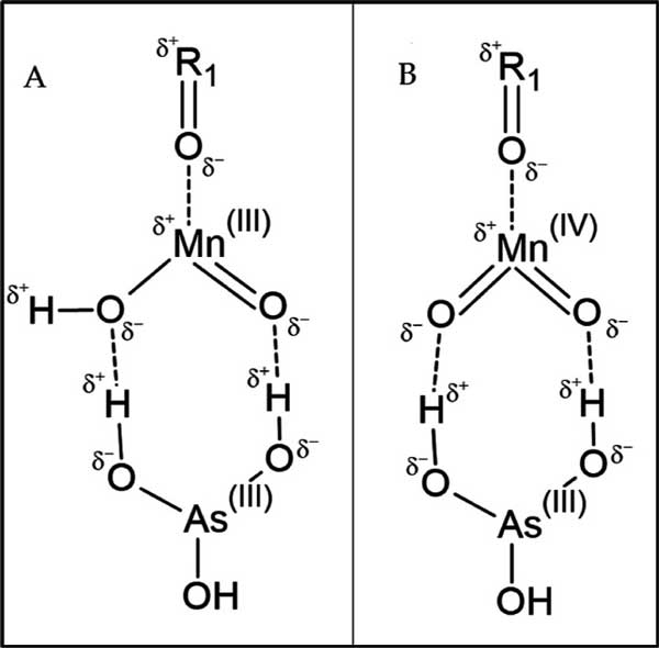 圖4:(A)顯示反應(yīng)(1)的產(chǎn)物,其中MnO被氧化為MnOOH。(B)顯示反應(yīng)(2)的產(chǎn)物,其中MnO被氧化成MnO2。As(III)通過(guò)氫鍵物理吸附到負(fù)載Mn的表面。