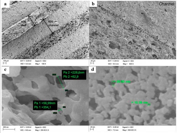 活性炭SEM圖像揭示了材料的孔隙性質。圖1a、b中的低放大圖像顯示了具有擠壓(墻)和內部(通道)結構差的單體縱向部分的主要形態(tài),其中高放大(圖1c、d)圖像分別顯示了小宏觀和中孔直徑范圍內孔內部結構的主要形態(tài)。