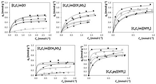 得到的結(jié)果表明,活性炭的不同的吸附能力與IL的性質(zhì)和溶液中的鹽量有關(guān)。一般而言,對(duì)于咪唑鎓的ILs,陰離子對(duì)其對(duì)活性炭的吸附能力的影響按照以下順序:Cl - ≈[CH 3 SO] <[CF 3 SO 3 ] -<[NTf 2 ] 。這一趨勢(shì)的結(jié)果和預(yù)計(jì)的相符合,并且表明,隨著陰離子疏水性的增加,活性炭對(duì)ILs的吸附逐漸增加。另一方面,考慮到IL陽離子家族,活性炭能吸附更多的吡啶鎓比基于咪唑類的對(duì)應(yīng)物?傊@里證明,如果伴隨使用無機(jī)鹽來促進(jìn)鹽析現(xiàn)象并增強(qiáng)隔離度,則活性炭也可以用作水介質(zhì)中低濃度存在的親水性IL的有效吸附劑。得到的結(jié)果表明, 在鹽的存在下,親水性ILs的例如[C 4 C 1 im] Cl和[C 4 C 1 im] [CH 3 SO3 ]的K d值增加高達(dá)5.5倍。這種新方法可以被設(shè)想為減少由使用IL的工業(yè)過程產(chǎn)生的含水物流污染的有希望的途徑。