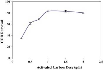 吸附劑劑量在廢水后處理吸附過(guò)程中起著重要的作用;钚蕴縿┝繌0.25到 2g / L的變化進(jìn)行了幾個(gè)實(shí)驗(yàn)。圖2顯示了對(duì)活性炭劑量的吸附容量(q)。 隨著吸附劑用量增加到0.75g / L,COD的殘留量從470mg / L 降至51mg / L,超過(guò)了COD的輕微下降。通過(guò)將吸附劑(GAC)的劑量增加到 2g / L,類(lèi)似物COD去除百分比從34.8%增加到81%。因此, 從經(jīng)濟(jì)角度來(lái)看,最佳的活性炭劑量是0.75g / L。