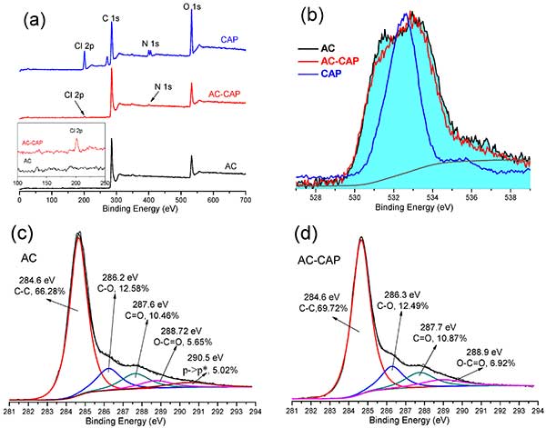 為了進(jìn)一步了解活性炭吸附氯霉素的機(jī)理,用XPS分析活性炭吸附前后的氯霉素(0.3 mmol / L)。圖2中示出了XPS測(cè)量光譜,活性炭吸附之前和之后的氯霉素的O 1s和C 1s峰。由C 1s譜確定的表面官能碳原子的計(jì)算相對(duì)含量也列于圖 2c,d中,并且計(jì)算的原子比率總結(jié)。主要的C 1s峰符合以下組的五條曲線:286.6eV的石墨結(jié)構(gòu),286.2eV的CO(苯酚,醇或醚基),287eV的C = O(羰基和醚基),O = 288.7eV處的CO(羧基或酯基),并且在290.5eV處π->π*躍遷。