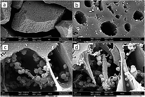 圖中(a)單個多孔活性炭在100倍放大的視圖,(b)高度多孔,不規(guī)則結(jié)構(gòu)化活性炭C在10000倍放大倍數(shù)下的特寫視圖,(c)和(d)細(xì)菌批量培養(yǎng)后,放大10000倍,負(fù)載固定在活性炭上。