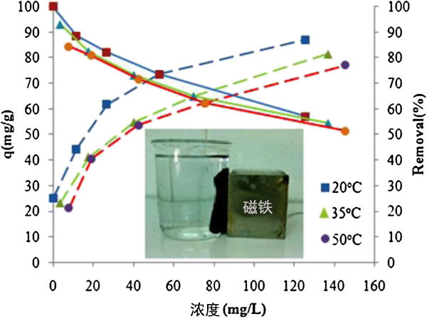 圖6、各種溫度對對活性炭吸附苯胺的影響:pH=6,t=300 min,濃度=50-300 mg/L,W=2 g/L,T=20-50°C。
