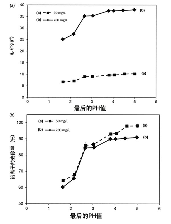 圖3.pH對(duì)活性炭明膠復(fù)合材料對(duì)鉛離子吸附的影響。活性炭明膠復(fù)合材料劑量0.15g/50ml,溫度23±2℃,鉛濃度(a)50mgl-1和(b)200mgl-1。