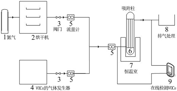 在吸附柱中研究了活性炭吸附甲苯的能力;钚蕴康挠昧繛10g,吸附質(zhì)甲苯氣體由氣體發(fā)生器產(chǎn)生。通過(guò)測(cè)定吸附前后甲苯的濃度,得到了不同條件下活性炭吸附性能的數(shù)據(jù)。實(shí)驗(yàn)吸附裝置的流程圖如圖2所示。將來(lái)自氣體發(fā)生器的甲苯氣體與氮?dú)饣旌希缓髮⑵湮皆诤銣匚剿。通過(guò)在線FID檢測(cè)器測(cè)量吸附前后的甲苯含量,并通過(guò)流量計(jì)控制甲苯流量。當(dāng)脫氣和入口濃度在30分鐘內(nèi)保持一致時(shí),認(rèn)為已達(dá)到吸附平衡。吸附氣體通過(guò)廢氣出口排空。