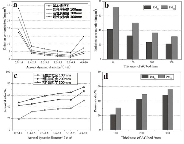 (1)活性炭去除PM 10比去除PM 2.5更有效,并且增加活性炭的吸附厚度或減小活性炭粒度有助于去除超細(xì)顆粒。除去率到PM 10和PM 2.5達(dá)到67.3%,并且當(dāng)活性炭厚度和顆粒尺寸分別為200mm至3-5毫米,吸附效果能達(dá)到58.7%。
