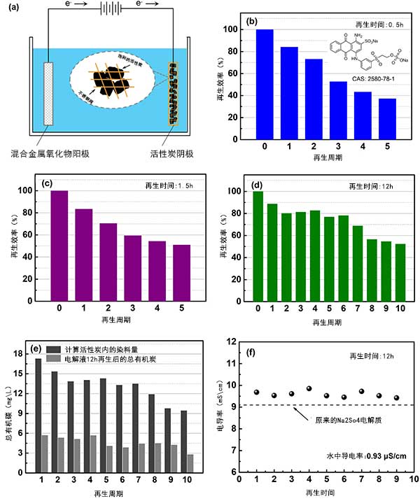 圖1。再生時間對RE和總有機碳(TOC)去除的影響。(a)設(shè)置示意圖。(b)-(d)當(dāng)再生時間分別為0.5小時(b),1.5小時(c)和12小時(d)時,RE的變化。(e)再生12小時后的電解質(zhì)TOC,并計算吸附在活性炭上的RB19的TOC。(f)12小時后電解質(zhì)的電導(dǎo)率超過10次再生。