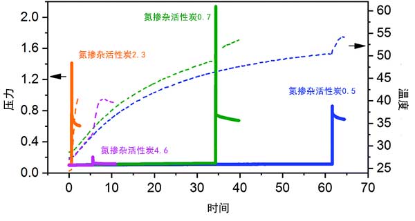 圖2: 不同質(zhì)量的氮摻雜活性炭機械化學(xué)合成的溫度(虛線)和壓力(實線)曲線。