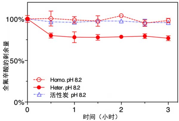 在存在和不存在活性炭的情況下,在密封的40mL燒瓶中在酸性,中性和堿性pH條件下進(jìn)行全氟辛酸與S 2 O 8的反應(yīng),反應(yīng)溫度為80℃,用恒溫水浴保持。對于大多數(shù)實驗,初始全氟辛酸濃度為0.5μM,活性炭濃度為200 mg/L,500 mg/L或1000 mg/L。對于酸性和堿性條件實驗,使用濃硫酸或150mM氫氧化鈉溶液將pH值調(diào)節(jié)至1.0或13.0。對于在pH 8.2下進(jìn)行的實驗,使用100mM硼酸鹽作為緩沖液(NaB(OH)4/H 3 BO 4)。在所有實驗中包括五個重復(fù)。