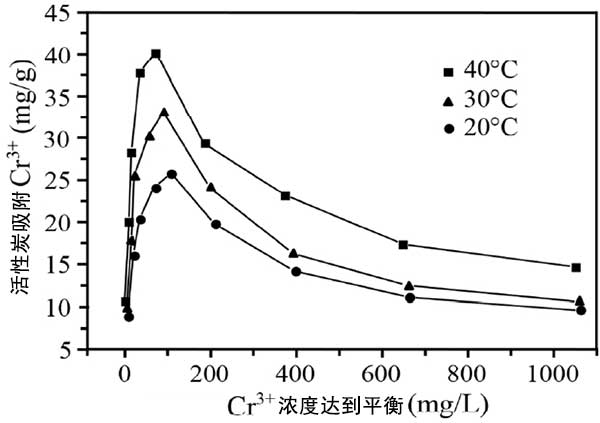 由于鉻在不超過40-50℃的溫度下與膠原結(jié)合,去污在低于這種熱值進行。然后,在20、30和40℃下測定活性炭上的等溫線,液體流出物大部分不含蛋白質(zhì)物質(zhì)和脂肪(圖1)。通過先前的實驗,確定懸浮液對于100至180rpm的攪拌速度保持均勻,而所有溶液在60分鐘內(nèi)達到平衡。在我們的系統(tǒng)中,三條曲線顯示了它們所代表的函數(shù)類型的罕見演化。對應(yīng)于非常低的平衡濃度的區(qū)域顯示出鉻吸收的突然增加。在更濃縮的平衡溶液中,這種百分比逐漸降低。