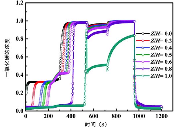 循環(huán)中活性炭床1上軸向CO濃度的變化在圖3顯示。在標記為Z/H的吸附床中精確定位7個測量點,分別為0.00,0.20,0.40,0.50,0.60,0.80和1.00,Z/H=0.00定義為吸附床的入口。從圖3中可以看出,在吸附步驟之后,吸附床處于Z/H=0.00-0.60達到CO吸附的飽和度。在ED步驟期間,一些雜質氣體從吸附床排出,并且CO濃度略微增加。在更換步驟中,吸附床中的CO濃度逐漸增加,并且在更換步驟后,吸附床中的CO濃度高于98%,除了床出口,即在更換步驟結束時,吸附床在Z/H=1.00時,CO吸附飽和。因此,活性炭在合適條件下被充分利用。