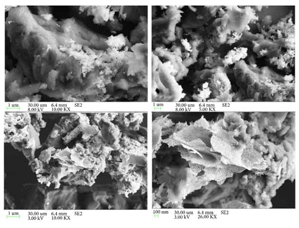 掃描電子顯微鏡分析:SEM研究證實了氧化鋅在活性炭載體上的負載,圖1示出了活性炭的SEM圖像?梢钥闯,活性炭呈細孔的不規(guī)則圖案。另外,氧化鋅顆粒沉積在活性炭的表面和孔中。仔細觀察表明活性炭表面上的片狀氧化鋅結(jié)構(gòu)。