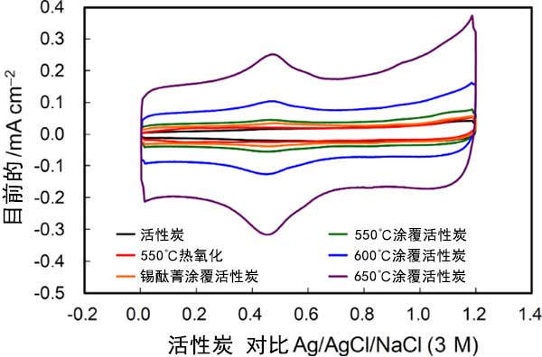 在沒有釩離子的酸性電解質(zhì)中獲得的循環(huán)伏安圖顯示在圖3中。伏安圖中的電流由三個組分組成,即活性炭-電解質(zhì)界面處的電化學雙層充電電流,以及由于表面官能團的氧化還原反應(yīng)和活性炭表面氧化引起的法拉第電流。電化學雙層充電產(chǎn)生恒定電流和矩形CV形狀。電流取決于基面和邊緣平面的曝光程度,在0.5V附近的寬氧化還原峰和0.8V以上的氧化電流分別歸因于醌/氫醌樣表面官能團的氧化還原反應(yīng)和活性炭表面氧化。這些電流在熱氧化后增加,并且在錫酞菁涂覆活性炭的熱氧化期間隨著溫度的升高而增加。電化學雙層電流的增加歸因于邊緣平面的暴露,這與拉曼光譜一致。對于錫酞菁涂覆活性炭觀察到的活性炭表面氧化電流意味著高表面粗糙度的發(fā)展。