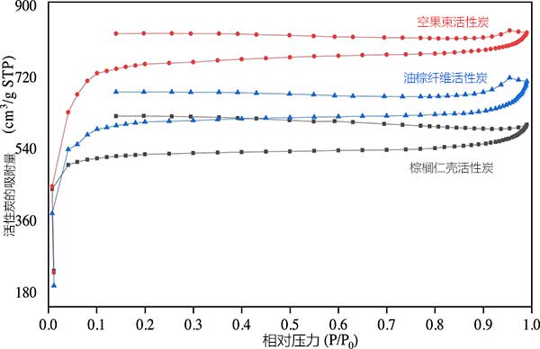 BET表面積和孔徑分布:所述吸附物在物理吸附過程中使用是氮氣。吸附和解吸等溫線用于估計每個活性炭的表面積和孔分布。圖5顯示了三種活性炭的等溫線圖。在低相對壓力下在所有樣品上觀察到開放式II型滯后曲線。據(jù)說,當(dāng)前體碳化過程中不完全燃燒導(dǎo)致孔隙收縮時,這種開口性和低相對壓力下的低吸附性隨著相對壓力的增加而增加]。