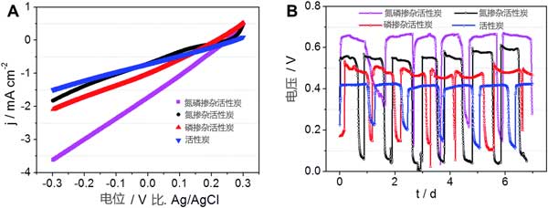 不同摻雜比的活性炭催化劑在微生物燃料電池中的實際性能,各種氧化還原催化劑的空氣陰極。線性掃描伏安法曲線由圖3A表明,所有的空氣陰極具有摻雜碳改性的活性炭催化劑表現(xiàn)出比原始活性炭催化劑的更高電流響應(yīng)。與氮摻雜和磷摻雜相比,氮磷共同摻雜的活性炭顯示高電流密度。如圖3B所示,使用雙摻雜的活性炭催化劑的空氣陰極燃料電池能夠在1000Ω的外部電阻上產(chǎn)生0.668V的穩(wěn)定電壓,這遠(yuǎn)高于本期制造的其它催化劑。這些結(jié)果意味著摻雜碳的改性是增強活性炭的氧化還原活性的可靠方法。此外,當(dāng)在微生物燃料電池的空氣陰極中用作氧化還原時,由氮和磷共摻雜碳改性制備的活性炭優(yōu)于氮磷單獨摻雜改性的活性炭。