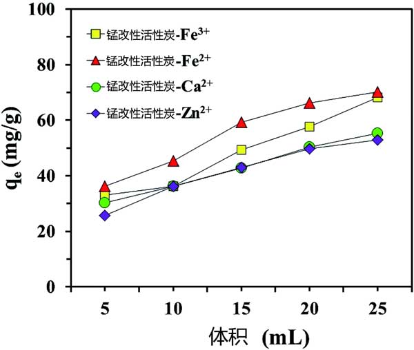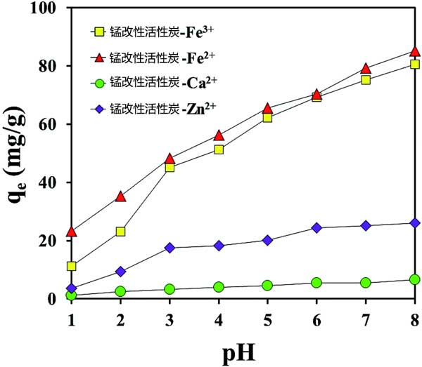 圖2:pH對(duì)高錳酸鉀改性活性炭吸附金屬陽離子的影響。