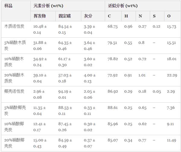 圖2:關于硝酸處理的活性炭的近似和元素分析的結果。