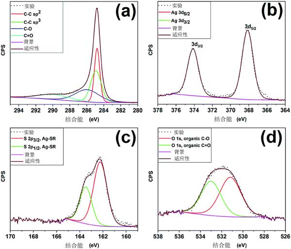 圖2顯示了所制備的活性炭樣品的組成元素的XPS光譜。XPS測量圖顯示碳,銀,硫和氧作為構(gòu)成元素的存在。S 1p光譜配有多個高斯分量,這些物種通常存在于活性炭表面上。圖2(b)分別顯示了多個峰,它們與零價態(tài)的銀原子一致。S 2p光譜的高分辨率光譜的反卷積,如圖2(c)所示,顯示兩個自旋軌道分裂為〜1.2 eV的峰。O 1s光譜顯示出不對稱的曲線,表明活性炭表面存在多種氧物質(zhì)(圖2d)。光譜的反卷積產(chǎn)生兩個,其可分別歸因于活性炭表面的C-O和C O物質(zhì),因此不存在金屬氧化物物質(zhì)?傊,XPS結(jié)果表明硫醇鹽配體保持附著在銀簇表面的表面上,并且在活性炭樣品中不發(fā)生銀原子的氧化。