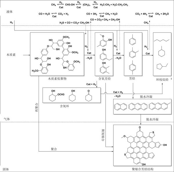 基于木質(zhì)素油的產(chǎn)物產(chǎn)率和組成,提出了一種用于加氫處理的反應(yīng)過(guò)程。木質(zhì)素使用活性炭催化劑和氫氣(圖3)。它涉及在液相和氣相中發(fā)生的許多連續(xù)和平行反應(yīng)。對(duì)低分子量烷基酚類和芳族化合物的所需反應(yīng)涉及通過(guò)裂解鍵來(lái)對(duì)木質(zhì)素進(jìn)行熱和催化解聚(加氫裂化)。最具反應(yīng)性的連接是醚鍵,盡管這些在木質(zhì)素中不是很豐富;钚蕴看呋瘎┐龠M(jìn)解聚反應(yīng),但在不存在活性炭催化劑的情況下的反應(yīng)也產(chǎn)生(有限)量的木質(zhì)素油,表明熱解聚反應(yīng)也起作用。低聚物片段可以進(jìn)一步解聚成烷基酚類形式的低分子量化合物或再聚合(也與已形成的低分子量化合物一起)成更高濃度的結(jié)構(gòu),最終導(dǎo)致燒焦。后一種途徑可能是熱反應(yīng),因此可以通過(guò)使用非常活潑的活性炭催化劑來(lái)抑制,所述催化劑通過(guò)催化隨后的轉(zhuǎn)化來(lái)減少活性中間體的量。中間低分子量烷基酚類在反應(yīng)條件下不是惰性的,并且可以進(jìn)一步加氫脫氧成芳族化合物和烷烴。