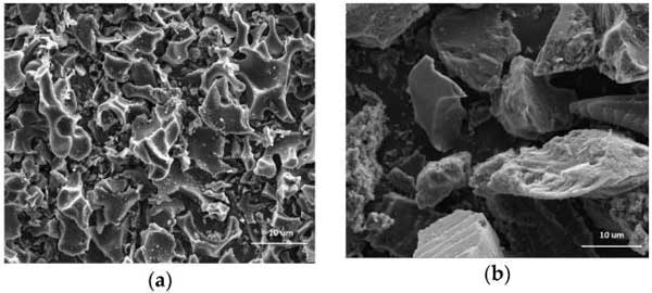 圖1:通過用(a)氫氧化鉀和(b)磷酸化學(xué)活化活性炭的微觀結(jié)構(gòu),通過SEM分析估計。
