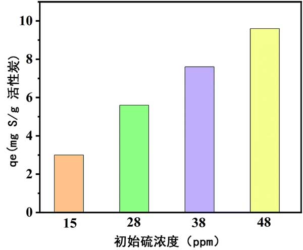 基于以上結(jié)構(gòu)表征和實(shí)驗(yàn)結(jié)果,得出了吸附機(jī)理。戊硫醇分子中的強(qiáng)路易斯酸S原子與活性炭中來自氧原子的一對電子相互作用。大孔和中孔的存在有助于活性炭的比表面積增加,暴露出更多的內(nèi)部原子,并促進(jìn)了質(zhì)量傳遞,從而使吸附劑易于與硫化物接觸。關(guān)于炭1.5的工業(yè)應(yīng)用前景,考慮了硫的初始濃度對吸附性能的影響。如圖3所示,對于初始含硫量分別為15、28、38和48 ppm的模型燃料,炭1.5的平衡吸附容量為每克吸附劑3.0、5.6、7.6和9.6 mgS。值得注意的是,在此濃度范圍內(nèi),吸附劑的硫去除率高于97%。這組結(jié)果表明該材料對于去除低濃度的硫化物具有明顯的工業(yè)應(yīng)用價(jià)值。