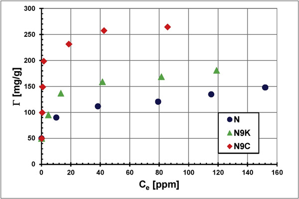 在圖3中比較了初始濃度為100 ppm的活性炭,N9K和N9C表面上初始濃度為100 ppm的聚合物溶液中PAA(Γ)的吸附量。?梢钥闯,對(duì)于所有檢查的活性炭,觀察到隨著pH升高聚合物吸附明顯減少。這是由于所檢查系統(tǒng)中的靜電條件從有利的吸引條件(在較低的pH值)變?yōu)椴焕呐懦鈼l件(在較高的pH值)而引起的。而且,在更酸性的環(huán)境中,聚合物鏈的盤(pán)繞構(gòu)型使得吸附層的堆積更為緊密(高PAA吸附)。在較高的pH值下,PAA鏈發(fā)展的增加導(dǎo)致表面層中吸附的大分子的構(gòu)型更加延長(zhǎng),其特征是聚合物鏈段的堆積密度顯著降低(PAA吸附低)。