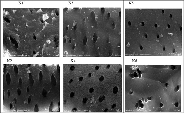 對(duì)原始活性炭(圖3中的K1)的掃描顯示出相當(dāng)均勻的孔。活性炭的結(jié)構(gòu)可以看作是薄片,為不規(guī)則分布和各種尺寸的孔提供了較大的吸附面積。表面上的大多數(shù)可見(jiàn)孔都在5微米范圍內(nèi),這與對(duì)椰殼活性炭的預(yù)期一致,而在這5微米孔內(nèi)可以看到小于1微米的較小孔。圖3中的K2顯示了在氯酸鹽吸附到表面活性部位后活性炭表面的變化。這些孔有變化的跡象,因?yàn)槠渲幸恍┪铰人猁},而其他孔被氯酸鹽和氯化物分子阻塞。在10,000倍的放大倍率下,可以觀察到小孔周?chē)痛罂兹肟谔幍某练e,因?yàn)轭A(yù)計(jì)表面活性基團(tuán)會(huì)大量存在于這些區(qū)域;钚蕴康乃嵝栽偕鷺O有可能形成了表面活性部位,從而增強(qiáng)了活性炭吸附大量氯酸鹽的能力。