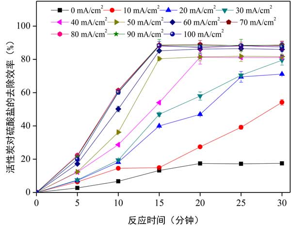 電流密度是一個(gè)關(guān)鍵參數(shù),它不僅影響凝結(jié)劑的用量,還影響氣泡的形成速率,氣泡的大小和絮凝物的生長。各種選定的電流密度:0、10、20、30、40、50、60、70、80、90和100mA/cm2在批量實(shí)驗(yàn)中應(yīng)用了,以建立電凝與活性炭耦合過程的有利電流密度范圍。在30分鐘的反應(yīng)時(shí)間下使用鋁不銹鋼陽極/陰極電極對進(jìn)行連續(xù)電凝工藝,并使用反應(yīng)器中的活性炭濃度為0.2g/L來研究電流密度對硫酸鹽的影響去除效率。與活性炭吸附工藝相比,電凝加活性炭即使在低電流密度(10mA/cm2)時(shí)也可以顯著提高去除效率。如圖2所示,活性炭吸附過程和電凝活性炭吸附偶聯(lián)過程的去除效率在5分鐘時(shí)分別為2.7%和6.3%,在30分鐘時(shí)分別為17.5和54.2%。由于偶合體系中的反應(yīng)比簡單的活性炭吸附過程更復(fù)雜,因此去除效率有所提高。電凝結(jié)合活性炭吸附對硫酸鹽去除效率有重要影響。結(jié)果表明,去除效率隨著電流密度的增加而顯著提高。電流密度為70mA/cm2時(shí),去除效率最高(88.9%)。這種現(xiàn)象可以歸因于這樣的事實(shí),即在高電流密度下,氧化金屬的數(shù)量增加,從而導(dǎo)致大量的Al(OH)3(s)顆粒有利于去除污染物。