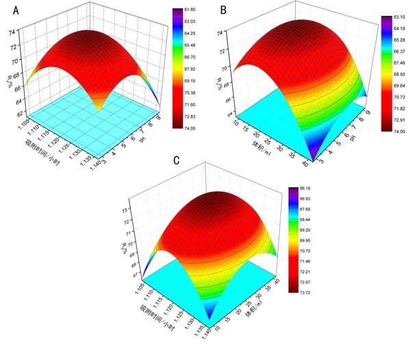 圖3:(A)吸附時(shí)間和pH在反應(yīng)表面上的相互作用。(B)pH和溶液在響應(yīng)表面上的相互作用。(C)吸附時(shí)間和溶液在反應(yīng)表面上的相互作用。