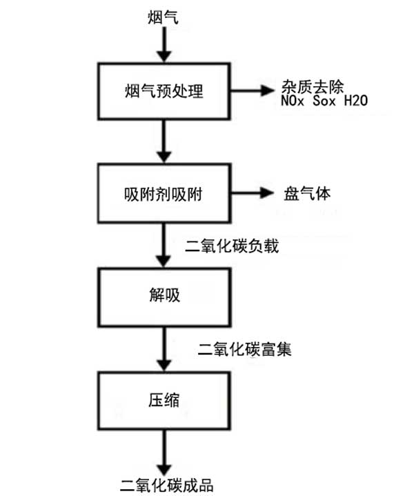 二氧化碳的吸附技術(shù)的簡(jiǎn)化圖在圖二顯示。首先將煙氣中的水分,硫和氮氧化物凈化。然后,所制備的氣體進(jìn)入使用固態(tài)吸附劑的吸附階段,例如活性炭,沸石,金屬有機(jī)骨架,多孔聚合物,基于堿金屬和胺的碳酸鹽的固體材料,碳球等。之后,吸附劑進(jìn)入解吸階段,在此階段釋放出富含CO2的氣體混合物,然后在壓力下將其壓縮。該技術(shù)的優(yōu)點(diǎn)是二氧化碳萃取效率高,再生成本低以及吸附劑操作的穩(wěn)定性;钚蕴繉(duì)CO2和N2的吸附能力很高,具有不同于沸石的大比表面積,并且還可以在潮濕條件下工作。而且,活性炭比沸石具有更低的吸附熱,因此它們可以更容易地再生。因此,在25°C和1bar的溫度下,活性炭的吸附熱為3kJ,而沸石為30kJ。收集二氧化碳的吸附劑質(zhì)量的重要指標(biāo)之一是二氧化碳的吸附量;旧希陟o態(tài)條件下和動(dòng)態(tài)條件下都進(jìn)行吸附容量的研究。