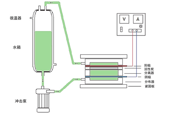 在這項研究中,已開發(fā)出用于溴化物電吸附的壓濾電化學(xué)電池。為了使電化學(xué)電池與受污染的水通過更寬的活性炭床接觸,已經(jīng)對其進(jìn)行了修改。在實驗過程中,水通過離心泵在陽極和陰極之間循環(huán),并通過發(fā)現(xiàn)為床的活性炭。這樣,可以獲得有關(guān)該間歇反應(yīng)器中吸附動力學(xué)以及平衡吸附量的信息。最后的數(shù)據(jù)對于了解由于施加電勢而可能提高活性炭的吸附容量非常重要。圖1中顯示了電化學(xué)電池和用于電吸附過程的設(shè)備的示意圖。