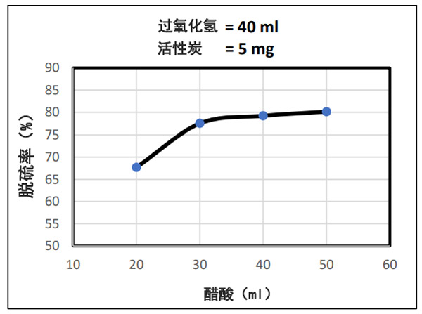 在本研究的最后三個樣本中,有H2O2和活性炭量是固定的,而乙酸的體積卻有所變化;旌衔镏幸宜岷康脑黾訒䦟(dǎo)致脫硫百分比的增加,因?yàn)榘l(fā)現(xiàn)乙酸具有比其他酸更好的氧化脫硫效果,而且大量的乙酸會導(dǎo)致過乙酸(CH3COOOH)的增加乙酸和(H2O2)之間的反應(yīng)產(chǎn)生的水量。(CH3COOOH)將與大量的硫化物反應(yīng),并將其氧化為砜或亞砜。該研究的結(jié)果顯示在圖(3)中。