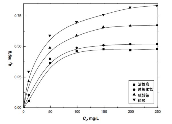 用活性炭和改性活性炭進行平衡吸附實驗,以評估它們使用合成的鎳廢水從水性介質(zhì)中除去二價鎳的能力。通過用0.1g活性炭與50mL濃度范圍為10mg/L至250mg/L的Ni(II)溶液平衡進行實驗,結(jié)果顯示在圖2中;钚蕴康拿靠宋饺萘恐蛋匆韵马樞蛟黾樱夯钚蕴>過氧化氫>硫酸銨>濃硝酸。氧化活性炭的容量增加是由于存在大量酸性基團,其可以與水溶液中存在的陽離子鎳交換它們的質(zhì)子。