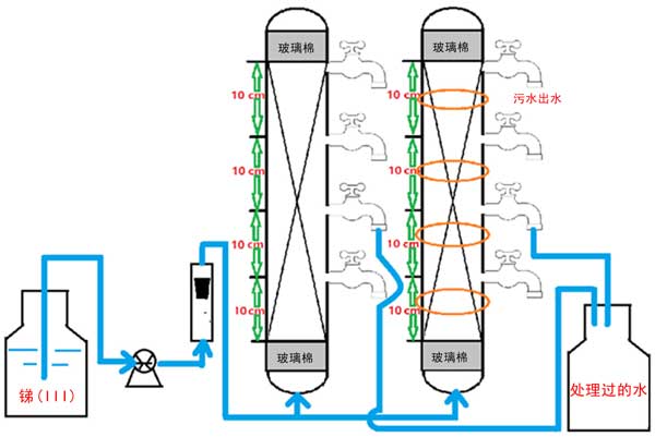我們進(jìn)行了色譜柱實(shí)驗(yàn),以了解弱磁場(chǎng)是否可用于提高連續(xù)流動(dòng)系統(tǒng)中納米級(jí)零價(jià)鐵的反應(yīng)性。設(shè)置了兩個(gè)平行的連續(xù)柱系統(tǒng),內(nèi)徑為10mm(外徑=14mm),高度為200mm,如圖1所示。一個(gè)柱系統(tǒng)有一系列環(huán)形永磁體,最大磁場(chǎng)通量強(qiáng)度約為1800Gs(材料:釹鐵硼),每5.0厘米放置一個(gè)環(huán)形磁鐵。聚甲基丙烯酸甲酯柱填充有10g鐵與活性炭(10-20目)的混合物。柱的兩端用一小塊玻璃棉塞住。圖1描述了色譜柱組件和與之配套的實(shí)驗(yàn)設(shè)計(jì)。測(cè)試是在25±1℃下完成的。為了獲得合適的流速,使用了蠕動(dòng)泵。銻(III)離子溶液通過鐵改性活性炭床向上轉(zhuǎn)移,以確保床完全飽和。為了評(píng)估銻(III)吸附去除情況,定期采集流出物樣品。